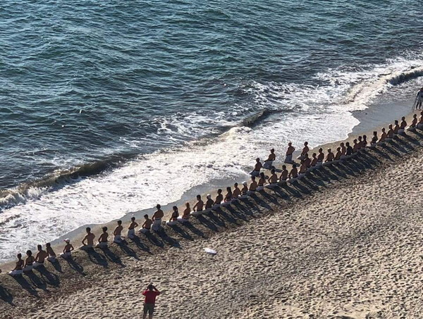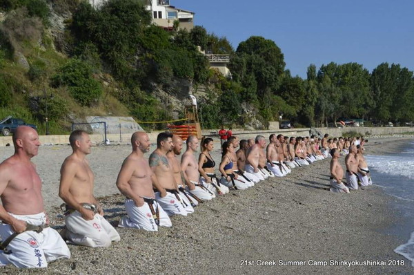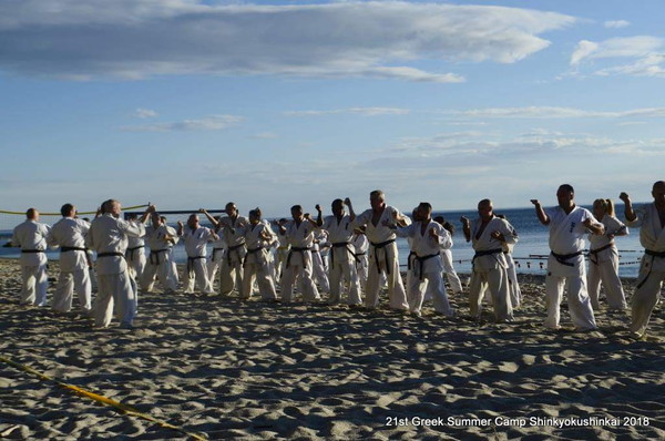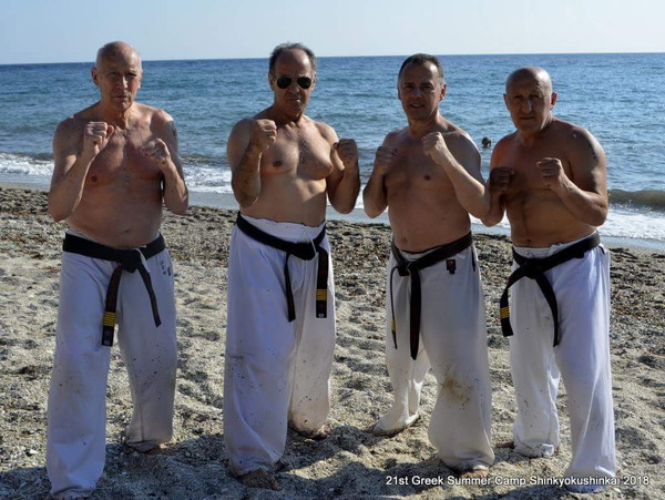 As the Kiais were blowing up the morning tranquility of the beach, more than 75 Shinkyokushinkai fighters were struggling in the sand –some other times against the waves- under the guidance of Shihan George Kosmidis.