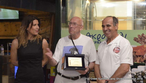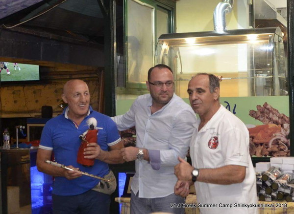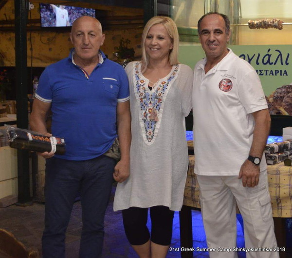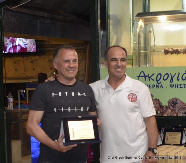 There, Shihan Kosmidis awarded some prominent and silent contributors of the Greek Shinkyokushinkai Summer Camp. Among others, Mr. Kosmidis awarded Sensei Aggelos Koufos, a Shotokan Karate master who attends all Shinkyokushinkai camps and has a shodan in our style and Dorothea Kolindrini, the Deputy Principal of the Thessaly Region who helps and supports the Greek Association. The one who helps for the promotion of the association is the press manager Sempai Pikoulas Sotiris.