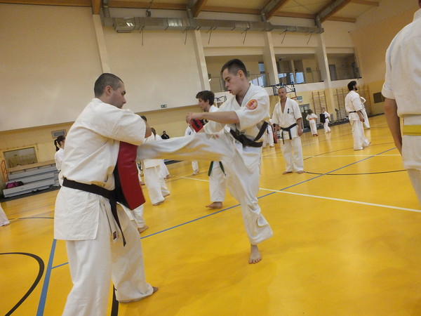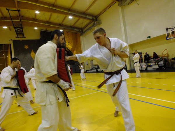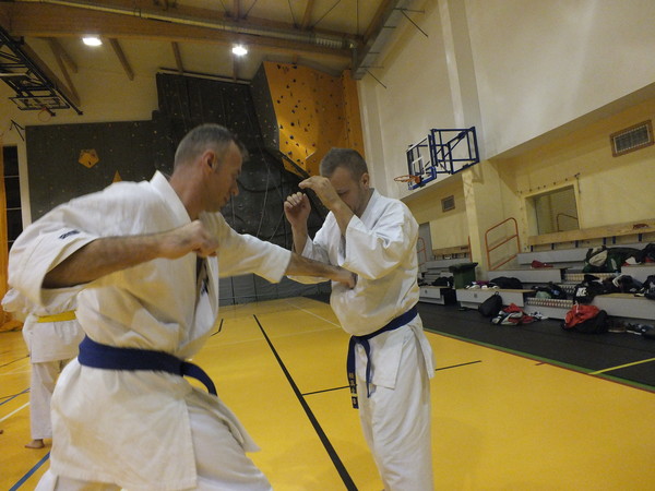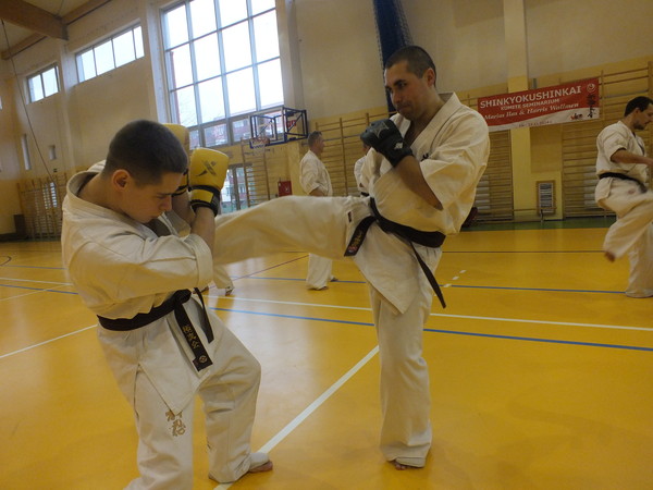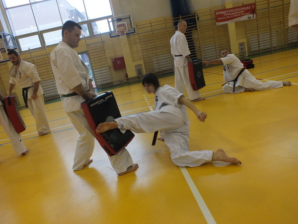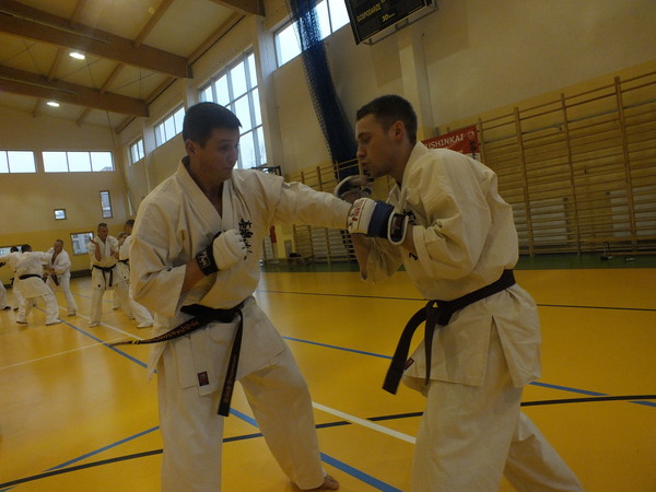 We held three sessions devoted entirely to kumite. The main theme of the seminar was to lead the fight in the short, medium and long distance. For this purpose, perfected combination with a partner, and worked on the faces of training. Specific way of fighting by Marius Ilas and at the same modesty and respect, and extensive knowledge of Harris Wallmen inspired many participants of the seminar.