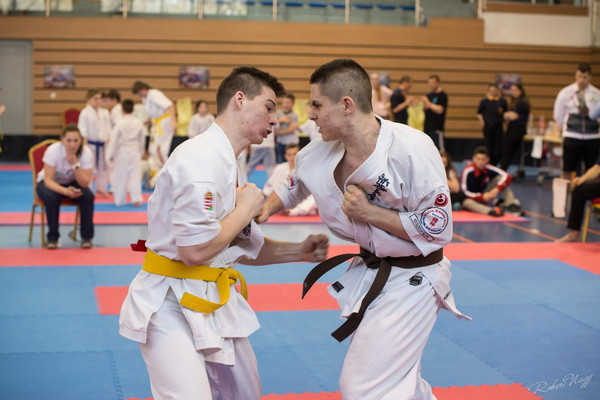 After this, János Markovics (leader of the Slovakian Shinkyokushin Organization) expressed his gratitude to the city administration of Dunajská Streda, Trnava county, sponsors and to the parents for the support of the tournament. He highlighted that this is an important event in the life of the club, as they focus on youth education. Age group of the tournament was from age 6 to adult. Fights took place on 5 tatamis. The national team performed excellently, Ádám Markovics, Adrienn Jakab and Zoltán Cserepes finished in first place. In his first adult tournament, Zoltán introduced with a beautiful head K.O. (Ippon), and Ádám also finished with a K.O. (Ippon) as a junior on his first adult tournament. Kids fought very passionately.