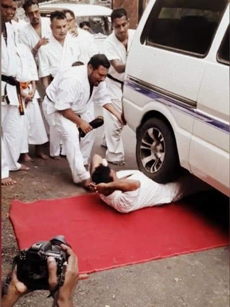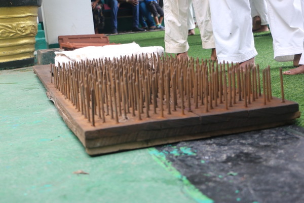 Breaking stones weighing over 100 kg with a hammer while lying on a plank covered with 4 inches nails by Branch Chief Raminda Perera