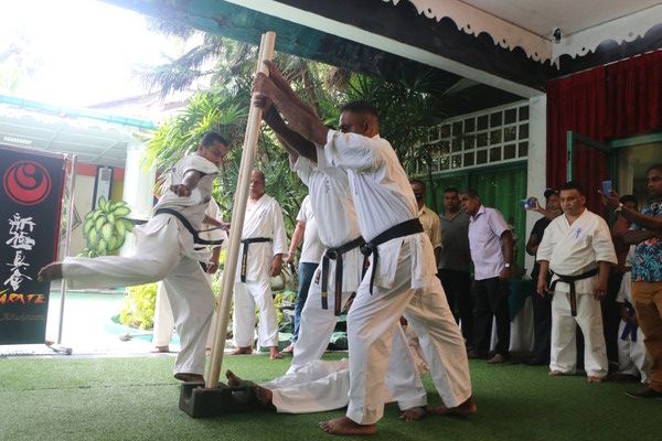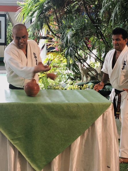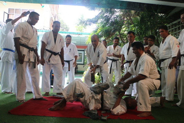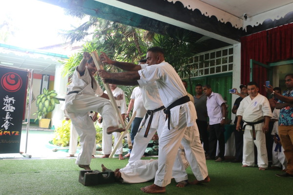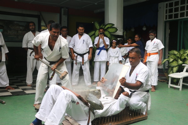 Breaking of two clubs of 3 inches diameter by Sempai Kasun Jayawardane
