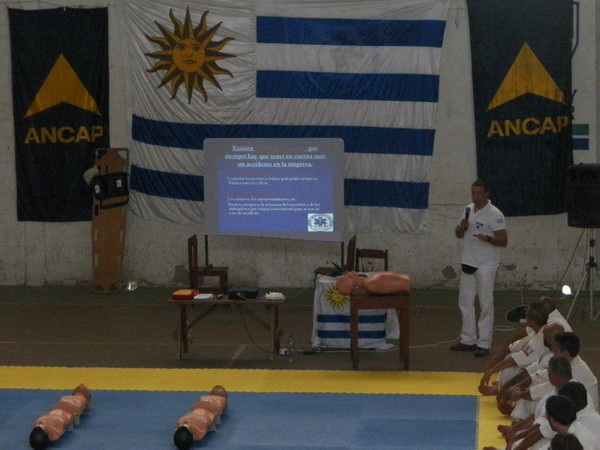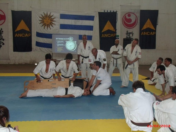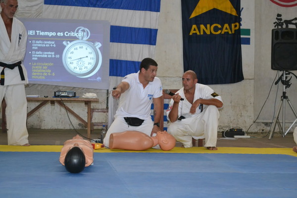 At 16:00 hs it was held an educational talk on first aids, by Marcelo Soca Sensei (3rd Dan), who is a paramedic and volunteer of TESSINF URUGUAY (EMERGENCY MEDICAL TECHNICIANS WITHOUT BORDERS). International NGDO Health Professionals Pre-hospital.). It gave basic guidance on issues of immobilization and mobilization, CPR (cardio pulmonary resuscitation), head trauma and useful first aids in situations that may result in daily life, but in our business are likely. This gave a major boost to this day, and is open to a more personalized new instance in which professors and judges will acquire more in detail these fundamental skills.